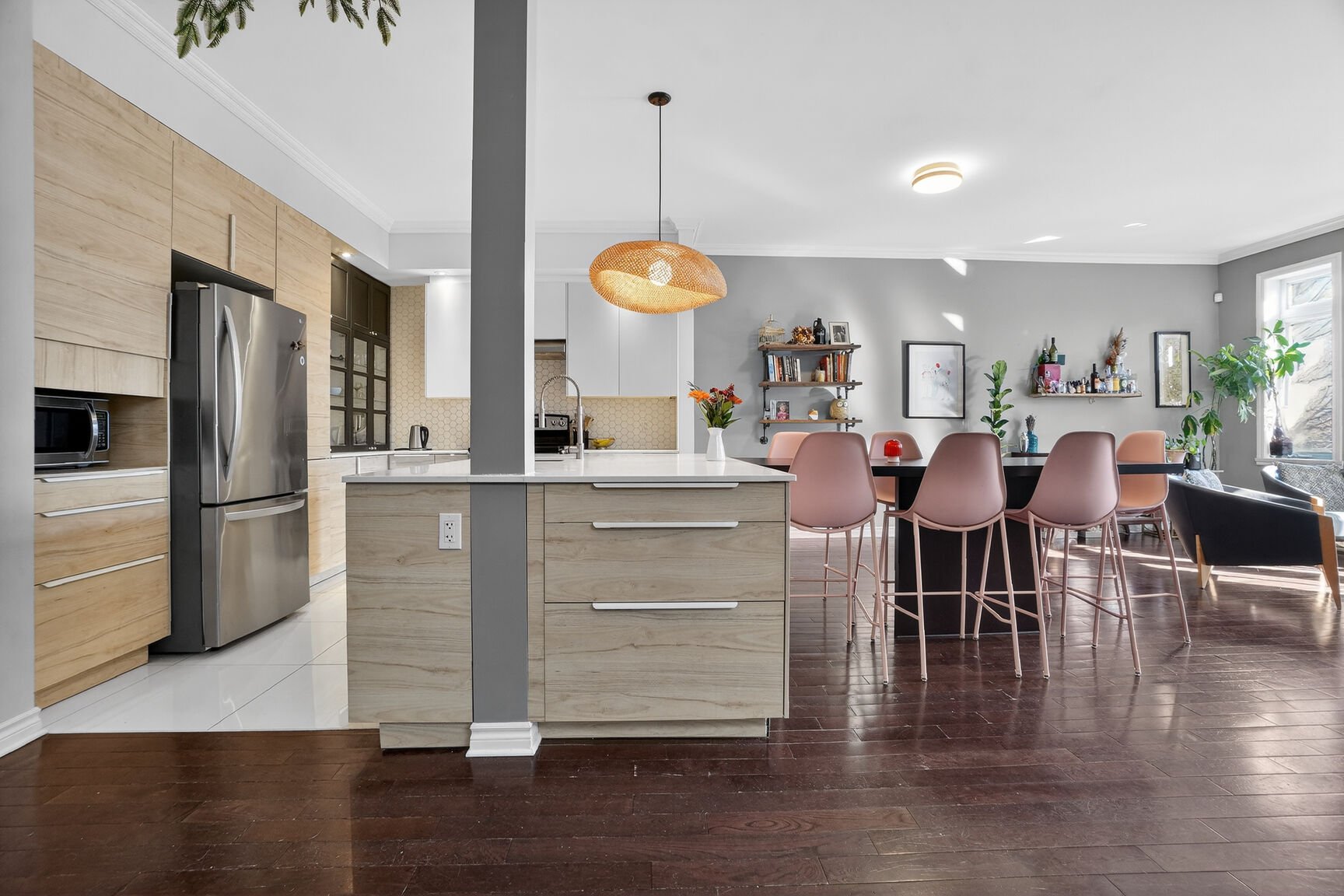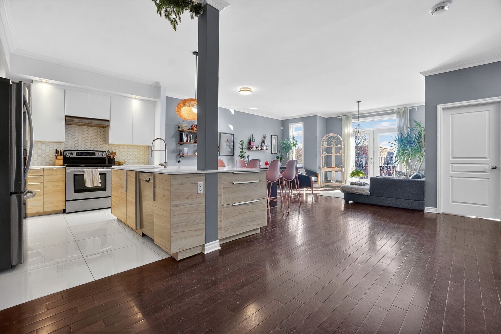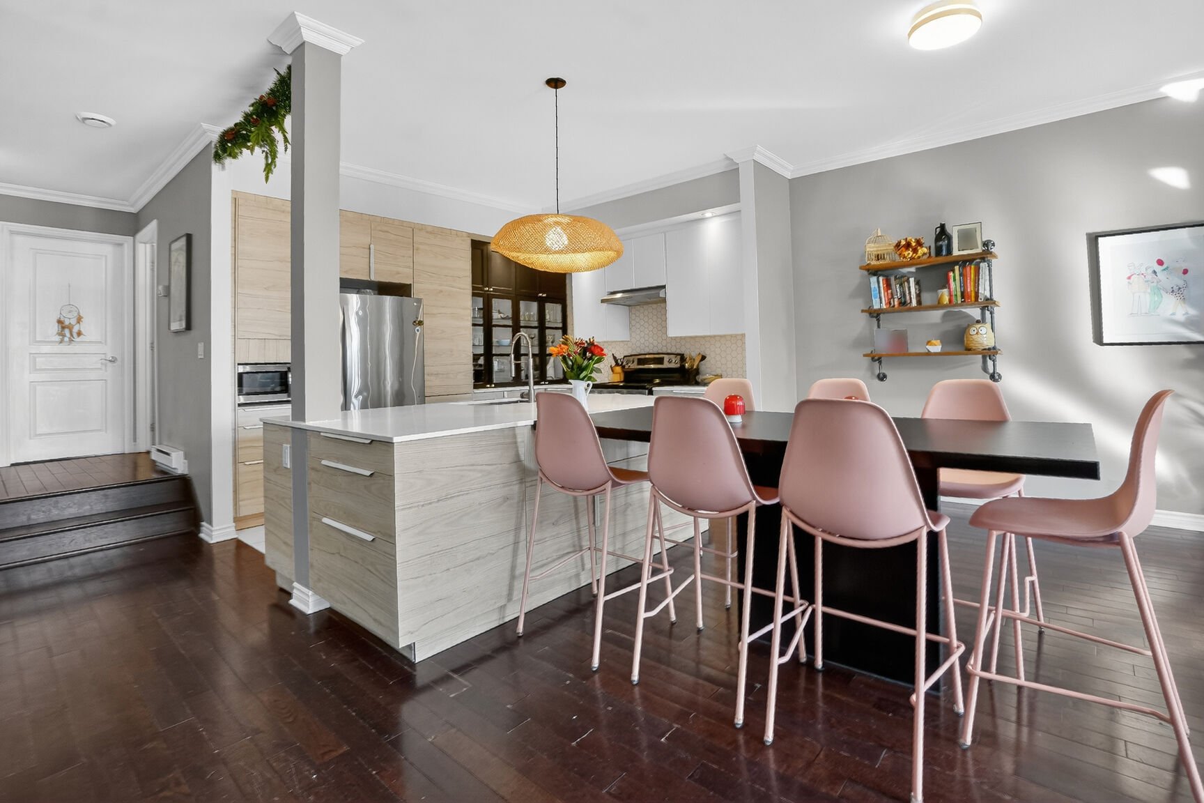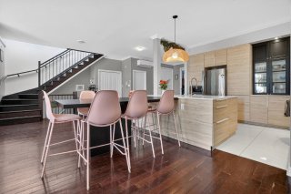 Dès le niveau principal, l'aire de vie ouverte impressionne par sa fluidité et sa luminosité naturelle abondante. Le salon et la salle à manger s'harmonisent parfaitement avec la cuisine entièrement rénovée, au design moderne et raffiné. Lignes épurées, finitions actuelles et aménagement optimisé en font un espace aussi esthétique que convivial, idéal pour recevoir et profiter du quotidien.