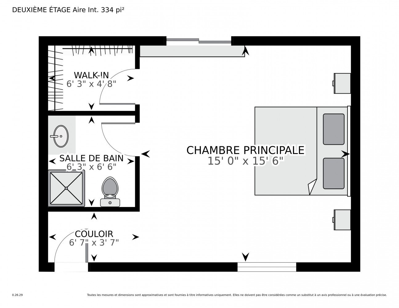 | Chambre à coucher principale | 15.0 x 15.6 P | 4ième étage | Bois |