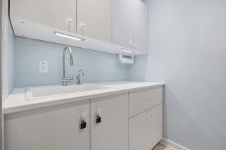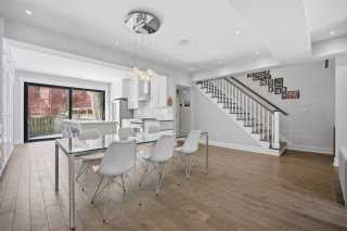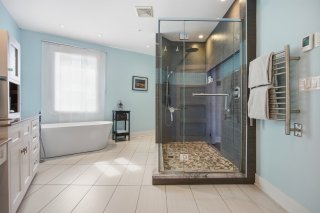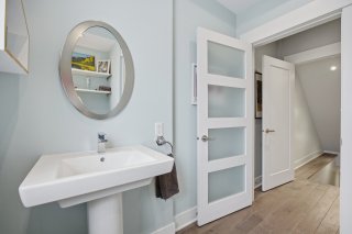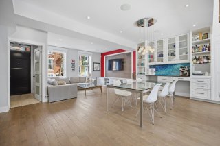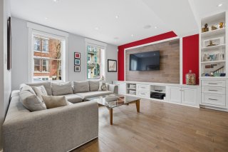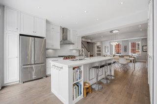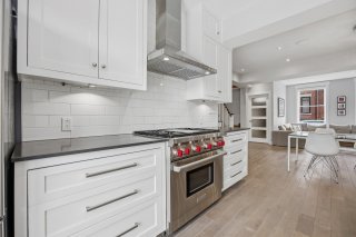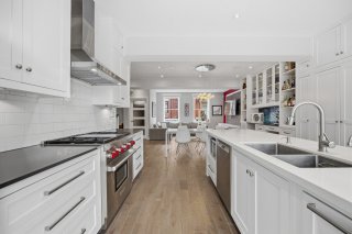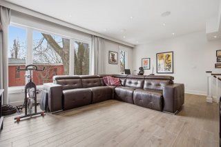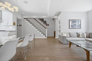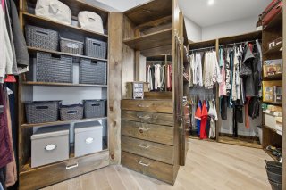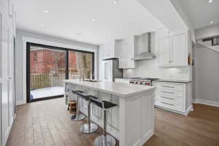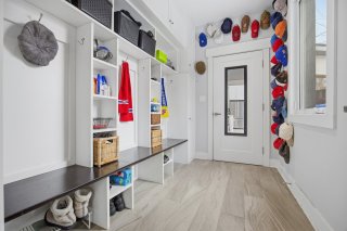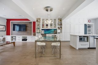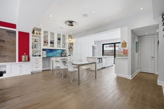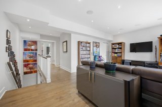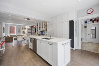 Le rez-de-chaussée propose un espace de vie lumineux et ouvert, rehaussé par des planchers de chêne blanc et un mobilier intégré sur mesure signé Heike's Fine Furnishing. La cuisine, véritable pièce maîtresse, se distingue par ses rangements intelligemment conçus jusqu'au plafond, ses équipements intégrés discrets, son espace café dédié et ses nombreuses fonctionnalités pensées pour un usage quotidien optimal. Un vaste mudroom parfaitement aménagé mène à un impressionnant garage double, une rareté dans le secteur.