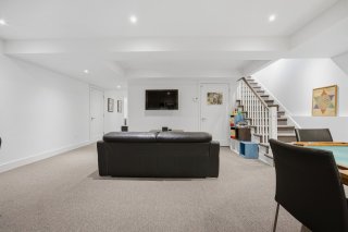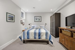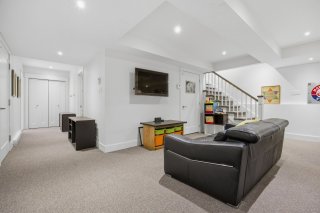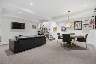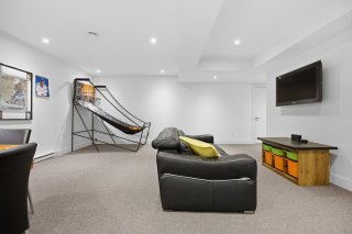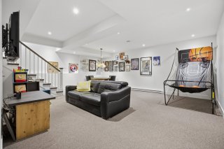 Le sous-sol, aux plafonds élevés, offre un espace polyvalent idéal pour une salle familiale ou un espace pour enfants, avec un accès direct au garage. La propriété est équipée d'un système de chauffage biénergie, d'une thermopompe, d'un thermostat intelligent avec capteurs et d'un système audio intégré.