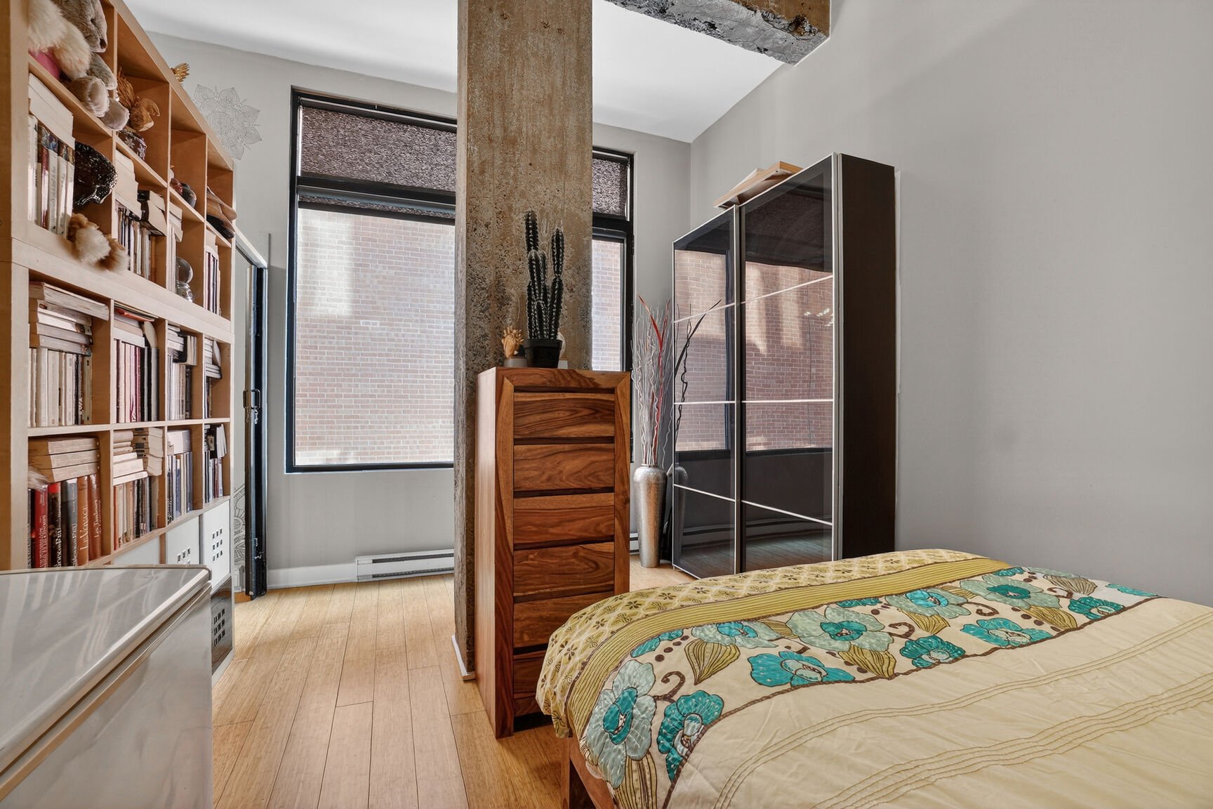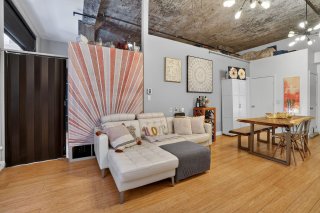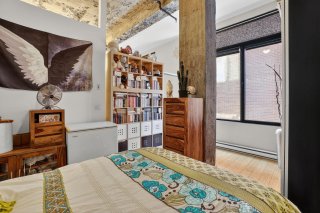 Ce bâtiment emblématique a conservé son caractère industriel d'origine, aujourd'hui très convoité. Cette unité de 584 pi² en est une parfaite expression. Les plafonds de béton d'origine de 12 pieds de hauteur créent une impression de grandeur remarquable, tandis que les grandes fenestrations de 8 pieds maximisent l'entrée de lumière naturelle et accentuent la sensation d'espace.