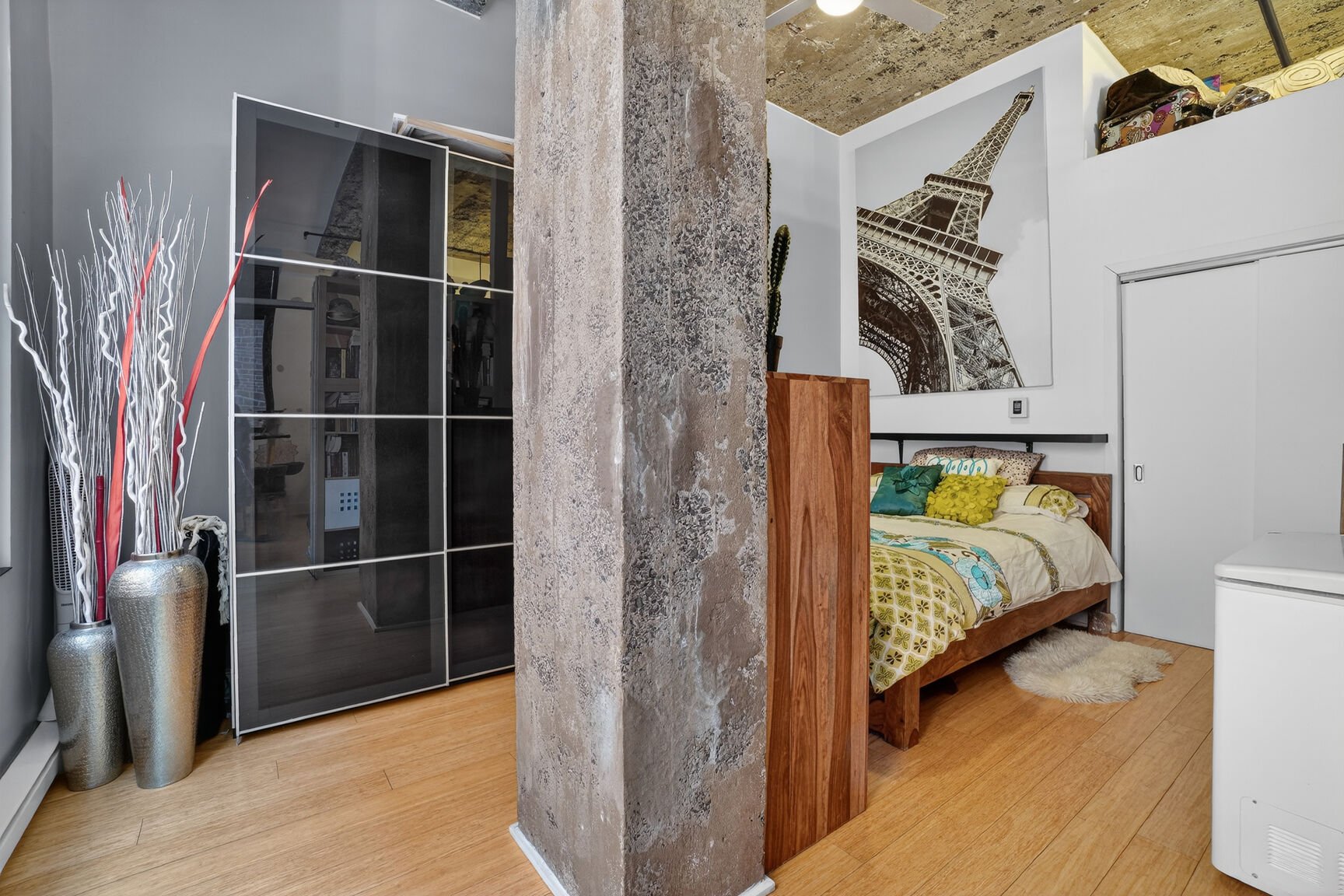 Inclus : Tous les électroménagers (sauf congélateur). Échelle pour la mezzanine. Tous les stores. Air climatisé mural (actuellement entreposé chez l'entreprise spécialisée pour entretien complet, incluant nettoyage et recharge du gaz; l'unité sera réinstallée au printemps). La tablette au dessus du lit.