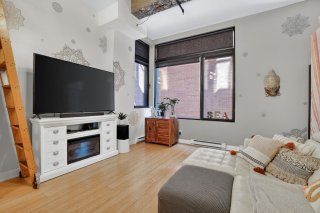 Le concept à aire ouverte est intelligemment configuré afin d'optimiser chaque pied carré. L'espace de vie principal est lumineux, chaleureux et polyvalent, convenant autant à un style de vie urbain actif qu'au télétravail. La chambre semi-fermée permet une séparation fonctionnelle tout en conservant l'esthétique loft recherchée. La salle de bains moderne, dotée d'une douche au design épuré, complète l'ensemble avec élégance. Les planchers ont été refaits en 2021, ajoutant une touche contemporaine appréciable.